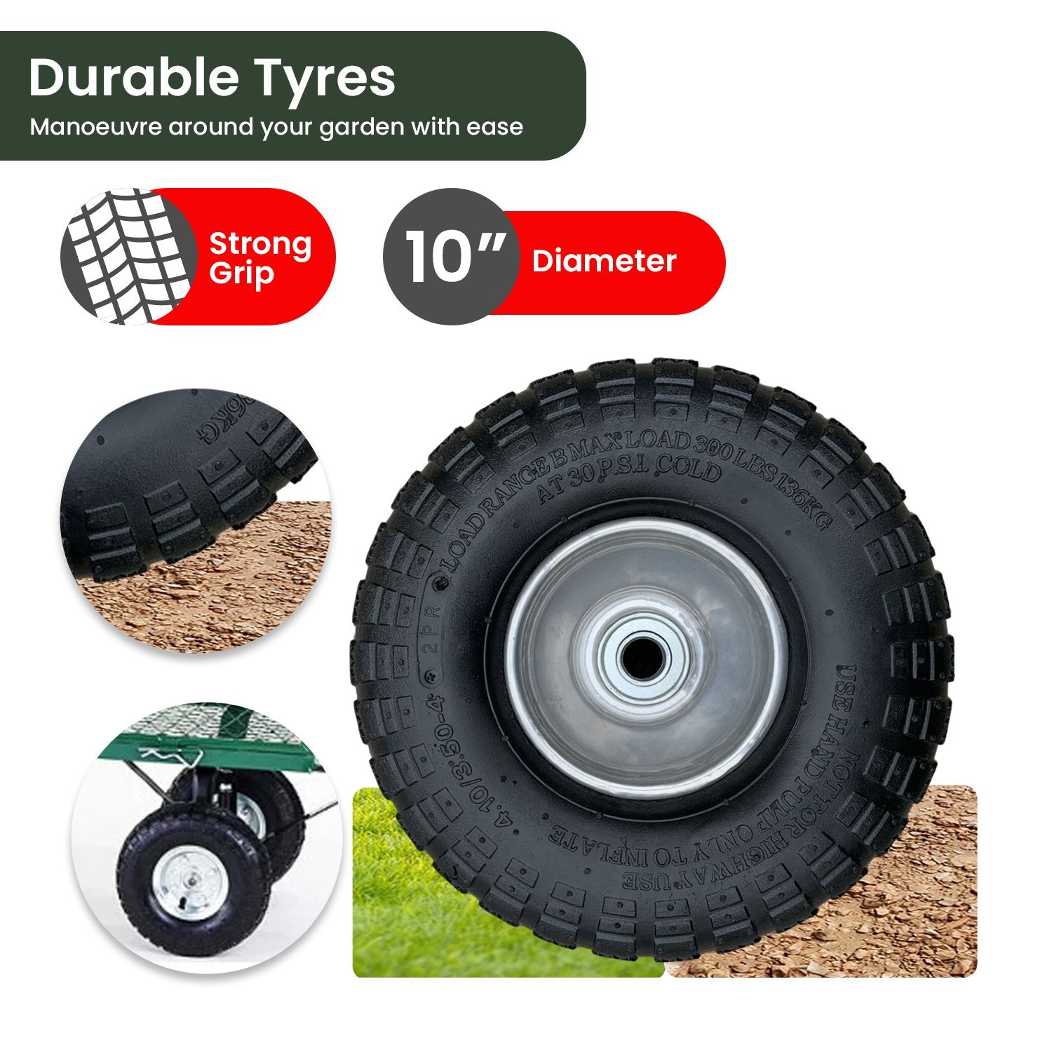 This heavy-duty garden cart makes landscaping jobs so much easier! It has a 300kg max loading capacity and 10-inch pneumatic tyres that can navigate your garden, yard and driveway with ease.