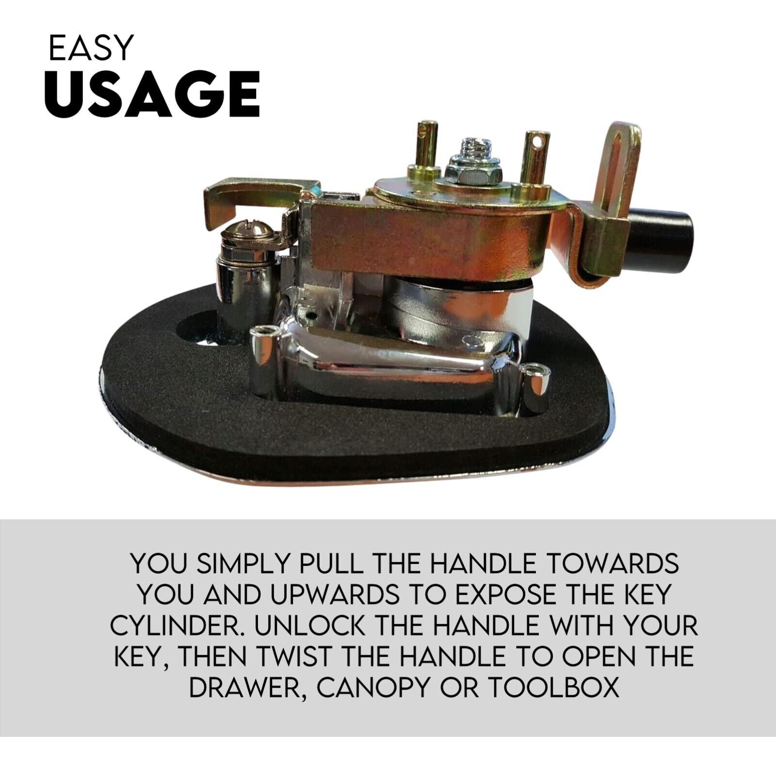 Our T-Handle latch lock is effortless to use. You pull the handle towards you and upwards to expose the key cylinder. Unlock the handle with your key, then twist the handle to open the drawer, canopy or toolbox. These lock handles are commonly used to tray and trundle boxes that have wide range of hinged fastener drawer slides with foam rubber seal and gas strut.