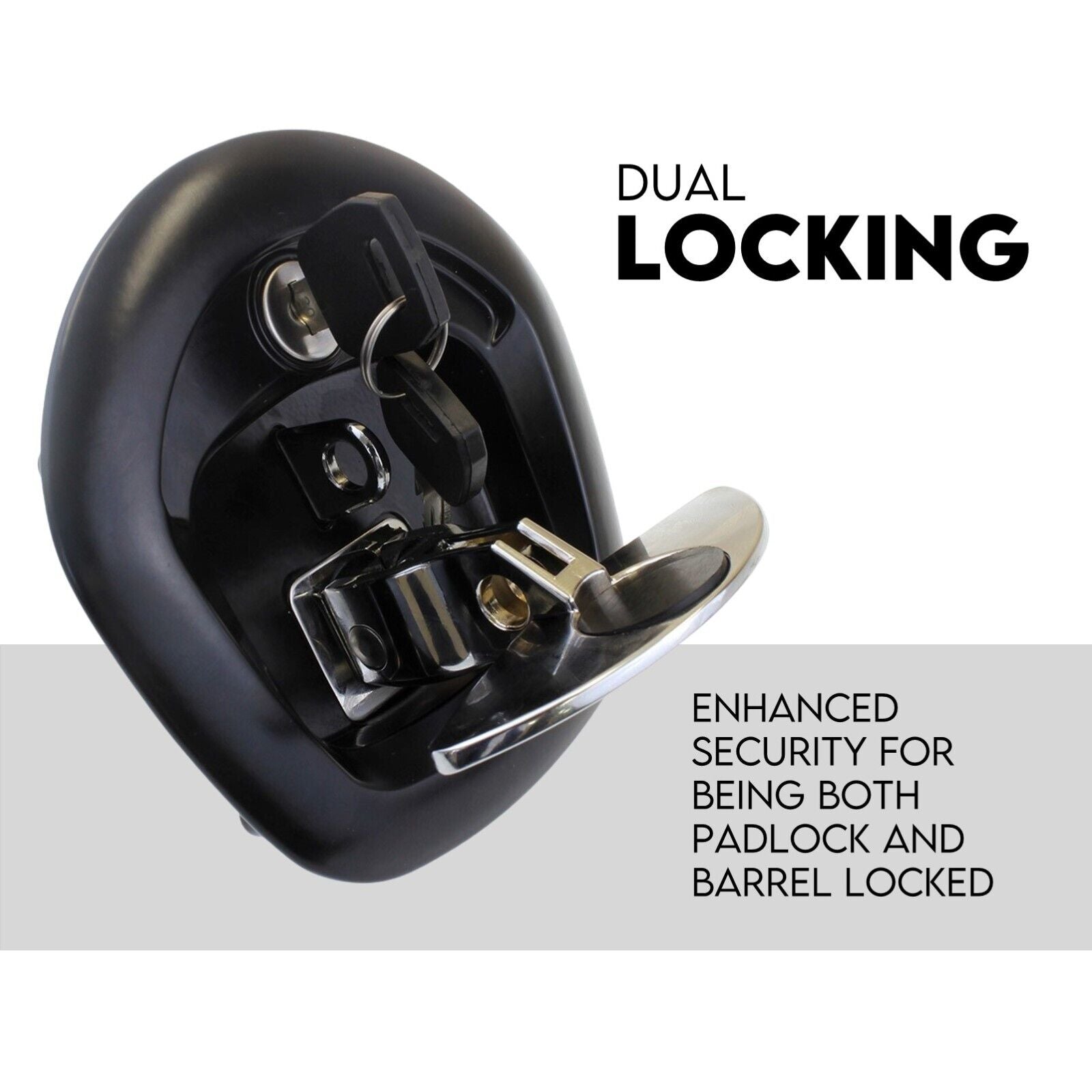 Our whale tail lock is dual locking, being both barrel locked and pad-lockable. The whale lock tail handles are popular when a job requires additional security to your toolboxes for campers, trailers,