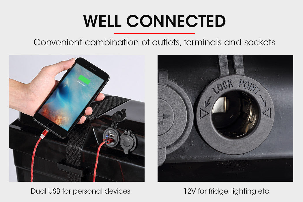 The Anderson plugs are individually fused, so you have plenty of flexibility in terms of how you use your battery box. You can use both plugs for charging your deep cycle battery, via sources like your folding solar panels or your alternator. Or, you can power accessories like your fridge and lighting via both sockets. And finally, you can even charge the battery through one plug while powering an accessory with the other.
