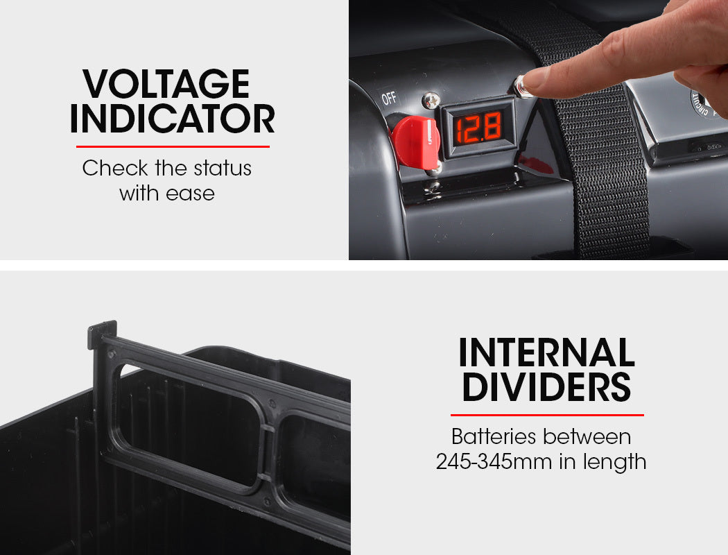 An adjustable internal divider ensures it can accommodate a wide range of battery sizes from 245-345mm in width. The LCD display allows you to keep tabs on the voltage with ease, and an isolator switch to separate your deep-cycle battery from the rest of your 12v system.